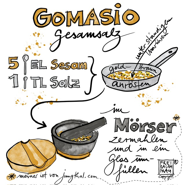 Gomasio wird auch als Sesamsalz bezeichnet. Es eignet sich wunderbar zum Würzen und spart eine Menge Salz. Zubereitung: In einer Pfanne 5 EL Sesam zusammen mit einem TL Salz goldbraun… Weiterlesen